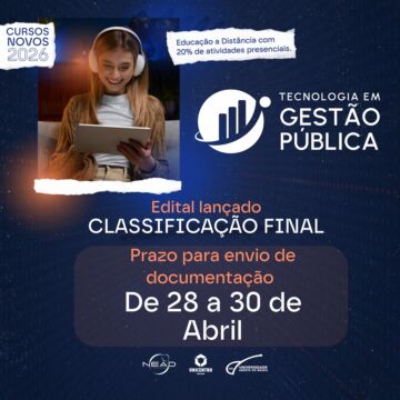 Estão abertas as inscrições para o Curso Superior de Tecnologia em Gestão Pública. O curso é ofertado na modalidade a distância e conta com 20% de atividades presenciais nos polos, em conformidade com a nova regulamentação sobre a EaD no Brasil.