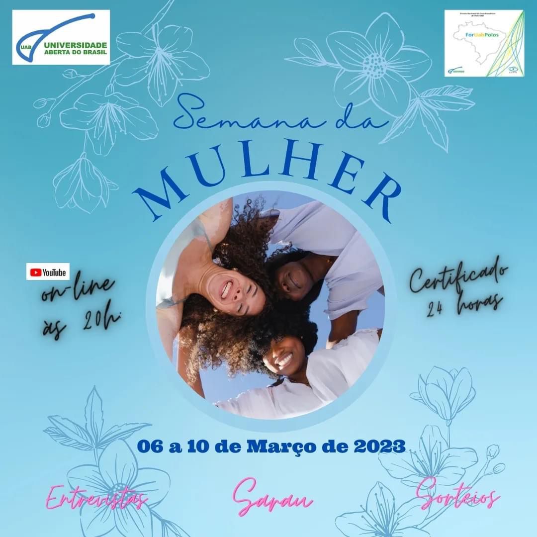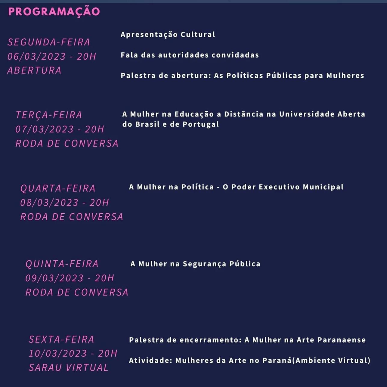 De 6 a 10 de março o polo UAB Guarapuava, em parceria com o Fórum Estadual de Coordenadores UAB, promove palestras on-line com mulheres guarapuavanas atuantes na política, como a secretária municipal da Mulher de Guarapuava, Priscila Schran, e a secretária municipal da Cultura de Guarapuava, Rita Felchak. Também serão realizadas rodas de conversa sobre o papel e a atuação da mulher na sociedade.